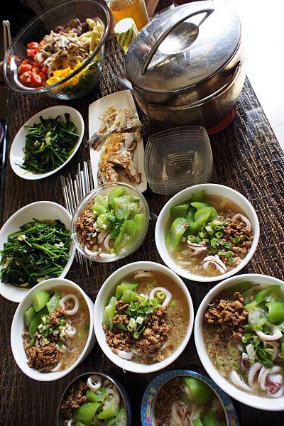 菜單:澎湖絲瓜小巻西衛麵線、深海鮮魚湯、炒菠菜與五色雞肉沙拉